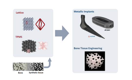 Figura 1: Las estructuras porosas basadas en barras (lattice) o superficies (TPMS ) que imitan la estructura ósea se pueden utilizar para desarrollar implantes ortopédicos o para aplicaciones de ingeniería tisular