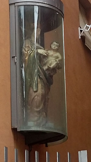 En la belena de Portalapea, sobre una ménsula, resguarda por un fanal, se conserva una talla de la primera mitad del siglo XVI, de ecos flamenquizantes, que estuvo situada en una hornacina en el Portal de la Galea que daba entrada al Burgo de San Cernin, en la zona conocida como Portalapea, por situarse a los pies de este Portal. Este tramo de las murallas se mantuvo hasta bien avanzado el siglo XVII, tal como da testimonio la documentación de un proceso judicial en 1651. Desaparecidas las murallas, la imagen se conservó en la fachada de uno de los edificios construidos sobre los fundamentos de las murallas. Allí estuvo, en concreto en una amplia hornacina en la casa n.º 14 de la calle San Saturnino, hasta que, tras la recuperación de la parte baja de las murallas de esta zona, la imagen quedó en la belena, adosada a los muros que se apoyan en los fundamentos de las murallas.