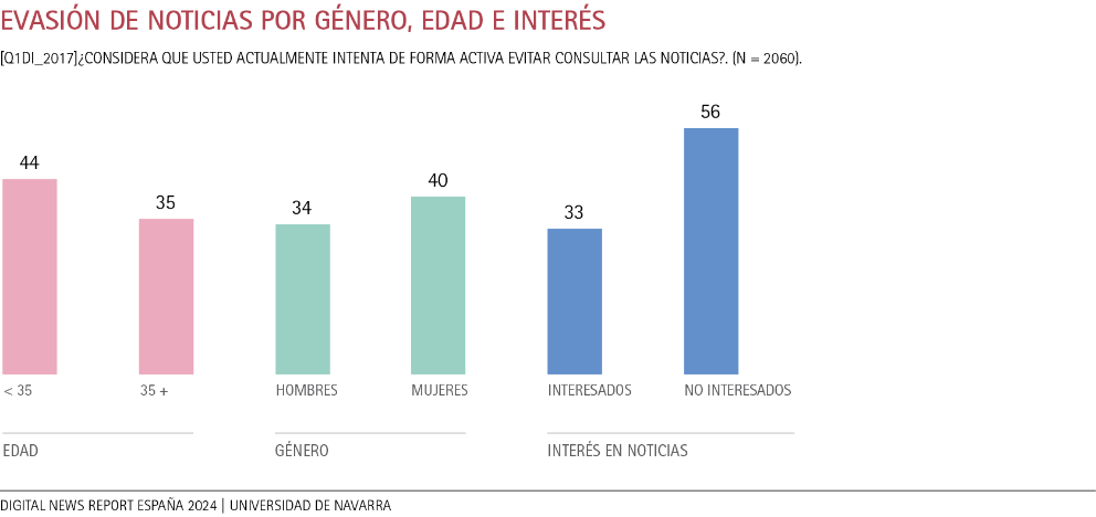 Nueva brecha generacional: los jóvenes evitan más las noticias (44%) que los mayores de 35 años (35%).