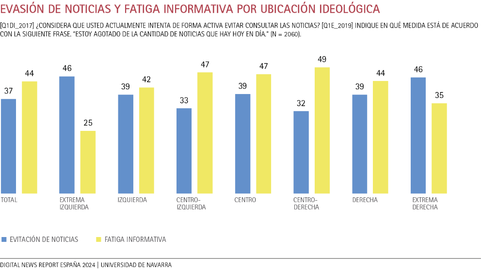 La relación entre la evitación de las noticias y la fatiga informativa es un fenómeno complejo que revela importantes tendencias en el comportamiento de los ciudadanos, especialmente en lo que respecta a su posicionamiento ideológico. En términos generales, los valores de fatiga informativa entre el total de encuestados españoles (44%) son superiores a los de la evasión de noticias (37%). Sin embargo, ambos fenómenos demuestran estar íntimamente relacionados. La sensación de sobreexposición a las noticias aumenta hasta el 58% entre aquellos ciudadanos que dicen evitar las noticias. O lo que es lo mismo, más de la mitad de los españoles que evitan las noticias declaran sentir una fatiga informativa, algo que sugiere una relación estrecha entre ambos fenómenos.