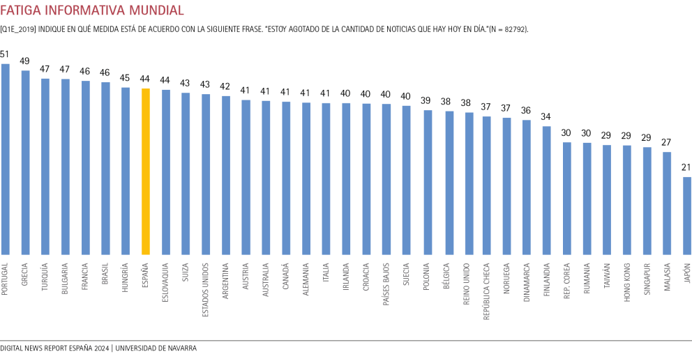 En términos generales, la fatiga informativa reconocida por los usuarios españoles se sitúa entre las diez más elevadas a nivel mundial, en línea con la que sienten los encuestados de países de nuestro entorno como Portugal o Francia. Con un considerable 44% de los encuestados en España afirmando experimentar esta fatiga, el dato sugiere una saturación significativa de información que podría estar influyendo en las actitudes de los ciudadanos hacia las noticias y su consumo.