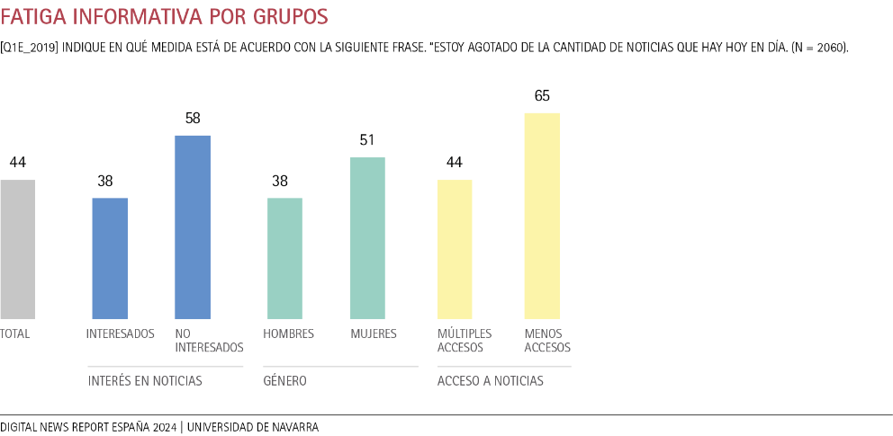 Los usuarios que muestran un elevado interés por las noticias tienden a admitir una fatiga informativa menor, con un porcentaje del 38%. En contraste, aquellos que demuestran un interés escaso por las noticias muestran un nivel más alto de fatiga (58%), confirmando la hipótesis planteada anteriormente y que vinculaba evasión y fatiga informativa: los españoles que más fatiga sienten son también aquellos para los que la información no es relevante.
