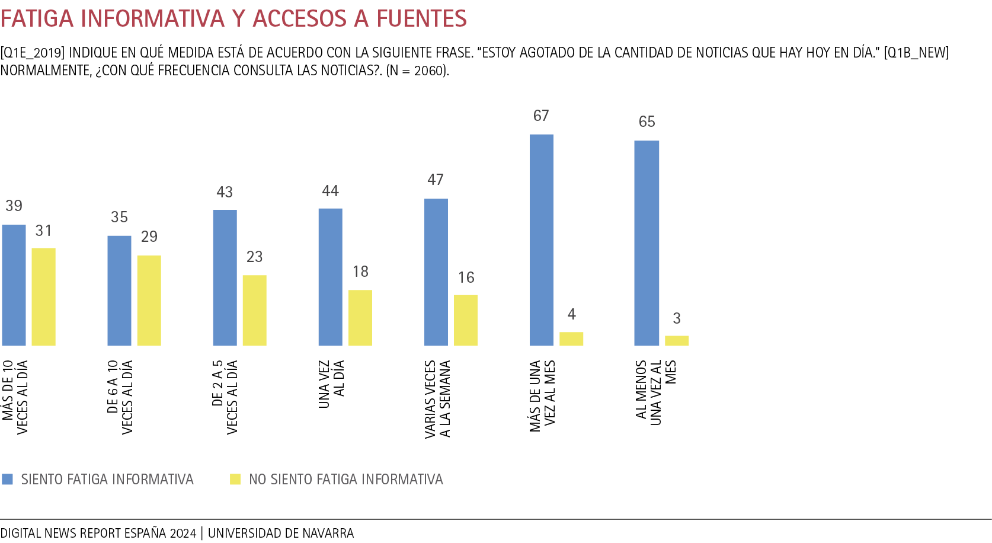La fatiga informativa es más elevada entre los encuestados que en menos ocasiones acceden a la información. Concretamente, un 67% de quienes dicen acceder a las noticias al menos una vez al mes, aunque no varias veces por semana, dicen experimentar esta fatiga. El fenómeno se mantiene en valores similares entre quienes consultan las noticias al menos una vez al mes (65%) y entre quienes casi nunca acceden a la información (60%). En contraste, este porcentaje disminuye significativamente entre quienes consumen información con mayor frecuencia. El promedio de entre quienes consultan la información con mayor asiduidad que dicen sentir fatiga informativa está en el 44%, dieciséis puntos porcentuales menos que aquellos que espacian más la consulta de noticias. Entre quienes consultan las noticias en múltiples ocasiones al día (más de 6), un tercio asegura no sentir fatiga informativa.