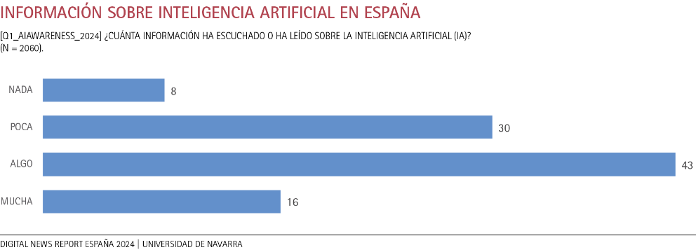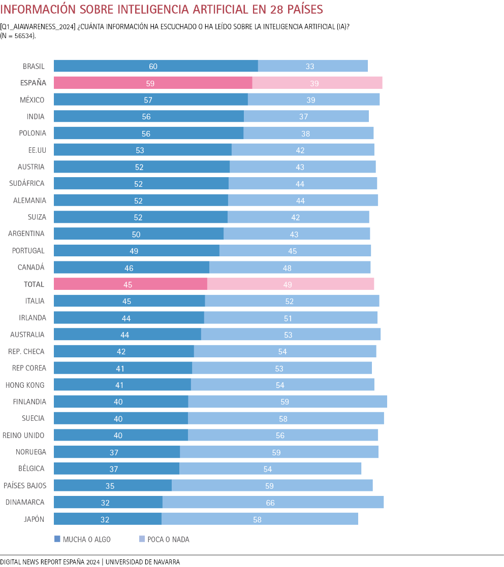 Sin duda, son relevantes los datos que apuntan la carencia de conocimientos sobre inteligencia artificial. La apreciación de las audiencias varía en función de su contexto y las razones no parecen ligarse a la ausencia de desarrollo tecnológico. Por el contrario, en países como Dinamarca (66%), Países Bajos (59%), Noruega (59%), Finlandia (59%), Francia (58%) y Japón (58%), cerca del 60% de las audiencias reconoce que cuenta con información limitada sobre la IA. Por lo tanto, la complejidad y el rápido desarrollo de técnicas y herramientas pueden ser algunas razones que expliquen esta percepción.