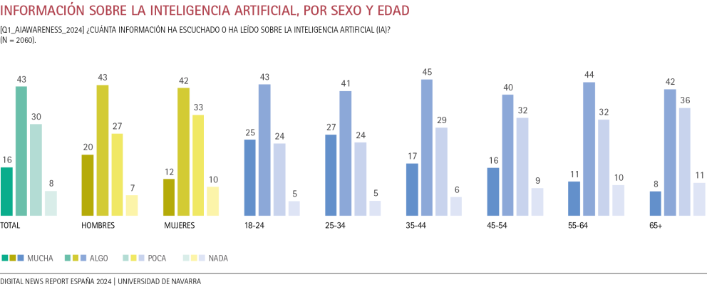 Al analizar los datos por sexo, apreciamos que el porcentaje de hombres que reconocen haber oído o leído mucho sobre IA (20%) supera notablemente al de mujeres (12%). En la distribución por edades, se observa un conocimiento moderado en todas las franjas de edad. Hay que apuntar que existe una mayor implicación con la IA en la población joven (entre 18 y 34 años). En consecuencia, al dirigir nuestra atención hacia grupos de edad más avanzada, se observa un aumento en el nivel de desconocimiento. Por ejemplo, el 47% de las personas mayores de 65 años declara tener escaso o nulo entendimiento sobre este asunto. Las causas que explican esta tendencia pueden incluir la falta de manejo tecnológico entre el público más veterano, la desconfianza en las plataformas o la necesidad de una mayor alfabetización digital.