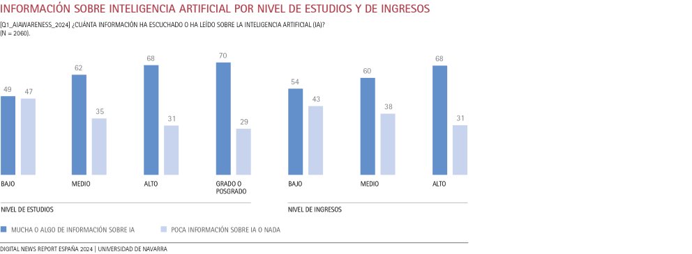 En lo relativo a la formación y a los recursos económicos, apreciamos que a medida que aumentan el nivel educativo y los ingresos crece el conocimiento de la audiencia sobre IA. Un factor esencial en esta distribución tiene que ver con el pago de algunas herramientas y la capacidad adquisitiva para solicitar suscripciones. Aquellos que cuentan con educación básica (47%) e ingresos bajos (43%) proyectan un mayor desconocimiento de esta tecnología.