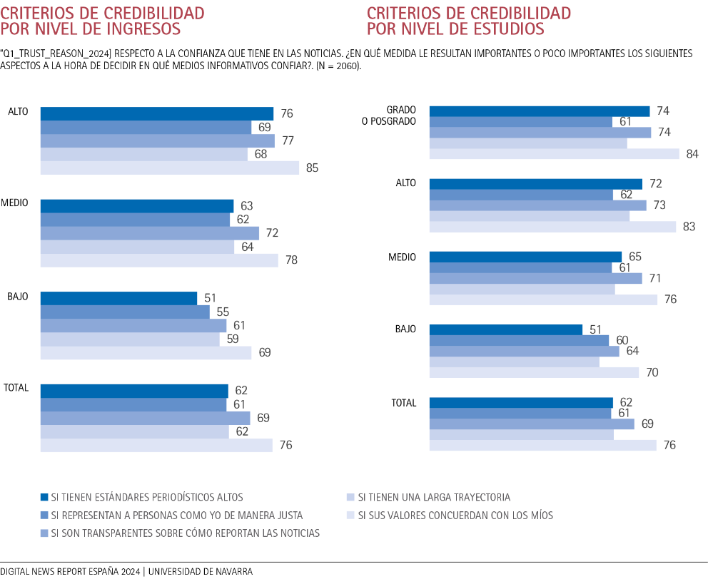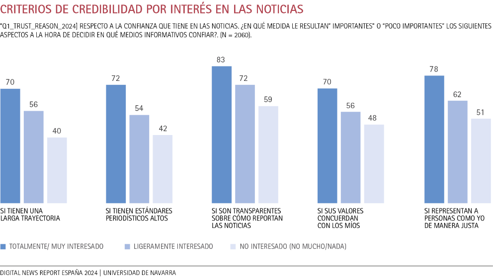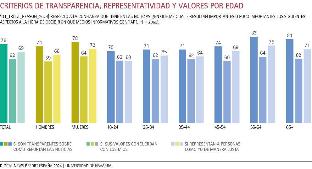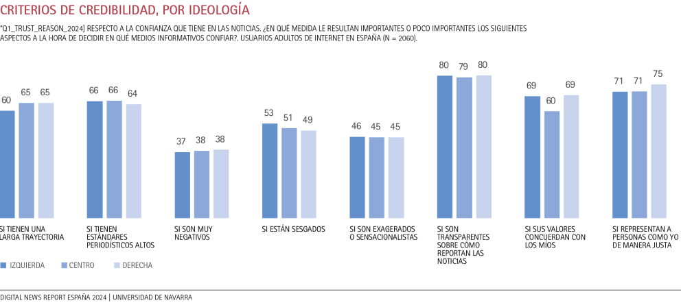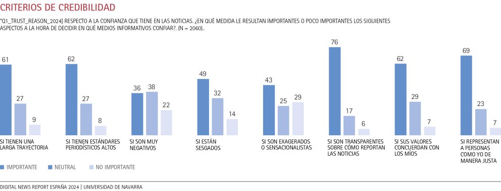 Además de los datos generales, la encuesta de 2024 incluye un apartado específico de criterios para la confianza en los medios. En el informe de este año se consultó a la audiencia española en qué medida considera importantes los siguientes aspectos para atribuir confianza a las noticias: trayectoria del medio, negatividad, sesgo ideológico, visión sensacionalista, transparencia, valores, representación justa de la ciudadanía y estándares periodísticos.