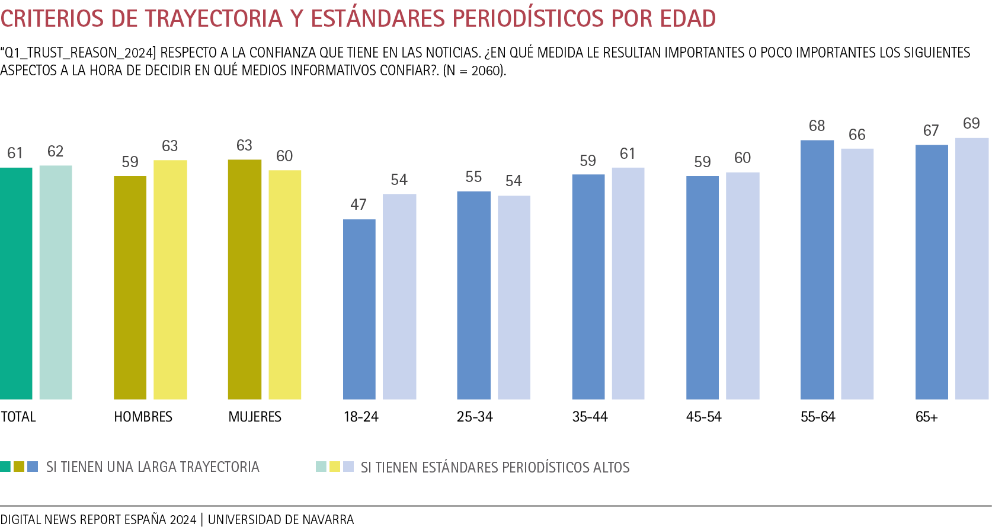 Al analizar otros aspectos destacados de confianza (trayectoria del medio y estándares periodísticos), apreciamos que el porcentaje de los hombres que atribuyen mayor importancia a los estándares periodísticos del medio (63%) es ligeramente superior al de las mujeres (60%). Sin embargo, las mujeres superan a los hombres al señalar la trayectoria del medio como un factor primordial. Como se puede ver, en ambos casos hay una tendencia ascendente en términos de edad. La trayectoria del medio de comunicación y sus estándares periodísticos suscitan más preocupación entre la audiencia veterana que entre los más jóvenes.