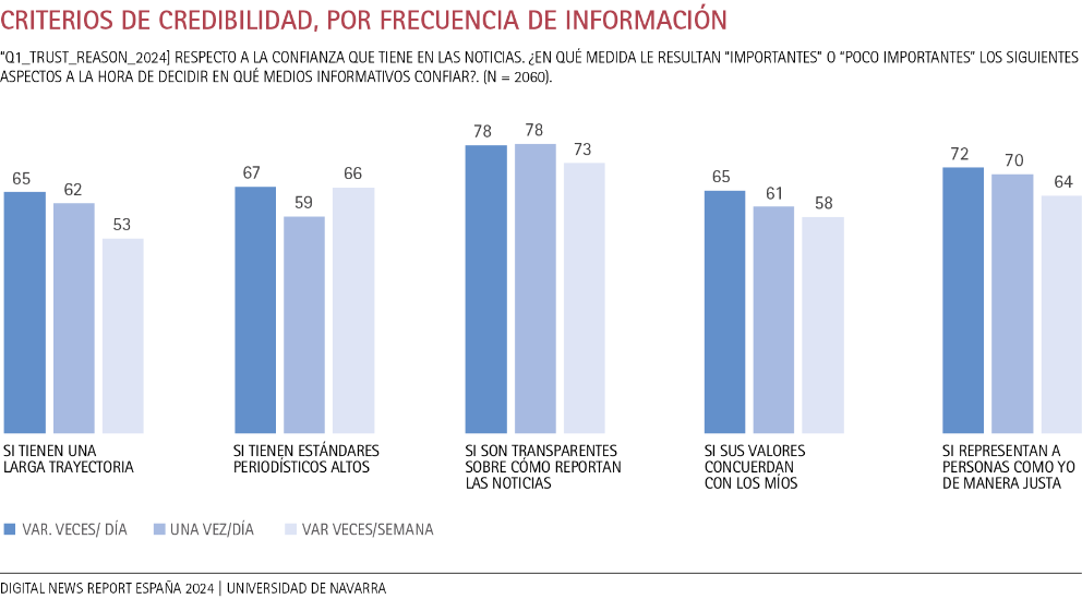 Si evaluamos los criterios de credibilidad en función de la frecuencia de consumo informativo, podemos establecer comparativas de mayor a menor grado de implicación. Como podemos ver en la gráfica, aquellos que optan por un consumo alto (varias veces al día) demuestran interés por los cinco criterios destacados con porcentajes que superan el 60% en cada caso. Una vez más, la transparencia (78%) y la representación justa de la ciudadanía (72%) reafirman el compromiso de la audiencia. Por su parte, un consumo diario y pautado de las noticias (una vez al día) refleja una tendencia similar que la audiencia más comprometida con la información. Hay que destacar que la cifra más baja se atribuye a la presencia de altos estándares periodísticos por parte de los medios de comunicación (59%). Por último, el consumo semanal de noticias presenta una tendencia distinta al consumo diario. A pesar de que la transparencia sigue siendo el criterio dominante, el segundo aspecto que más valoran los consumidores ocasionales de noticias es la presencia de estándares periodísticos altos (66%). Frente a esto, la trayectoria del medio pierde interés (53%). Por lo tanto, los indicadores profesionales son relevantes para aquellos que acceden de forma selectiva a las noticias.