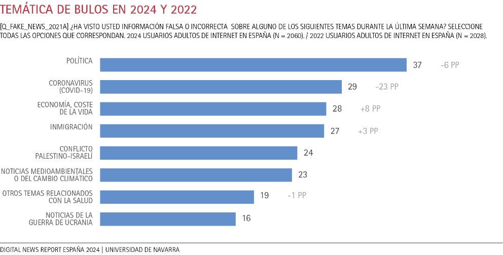 El análisis de los bulos por temática nos indica que el 37% de la audiencia española identifica información falsa o incorrecta sobre temas de política y un 29% sobre COVID-19. A estos valores le sigue la identificación de bulos sobre temas económicos (28%) y de inmigración (27%). Si comparamos los datos con los del informe del 2022, podemos apreciar que en 2024 disminuye la atención de la audiencia hacia la desinformación sobre la pandemia (23 puntos porcentuales menos) y temas de política (seis puntos porcentuales menos).