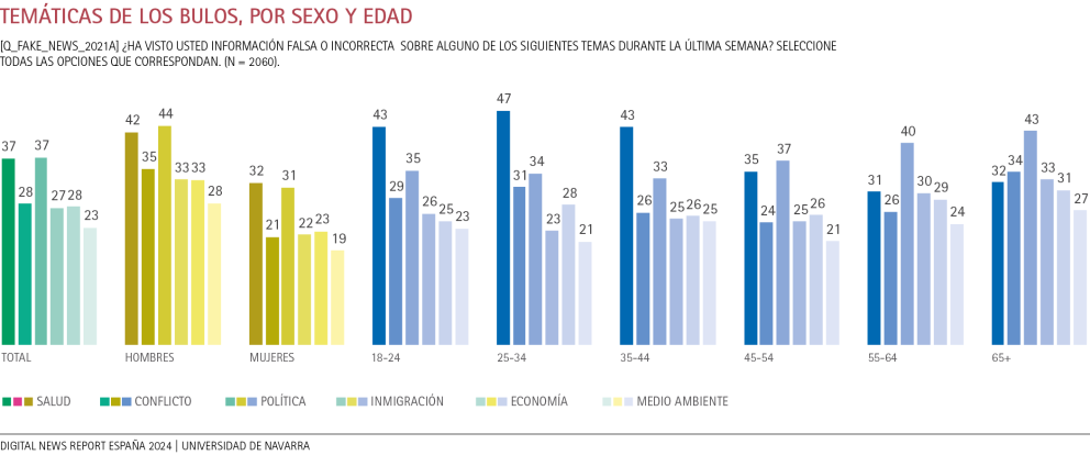 La identificación de bulos en los distintos tramos de edad revela diferencias notables. Las audiencias jóvenes (de 18 a 34 años) y de mediana edad (de 35 a 44 años) reconocen más contenidos de desinformación en relación a temas de salud. Como se puede ver en la gráfica, en los tres primeros tramos de edad el porcentaje de personas que han recibido contenidos falsos sobre salud es superior al 40%. Sin embargo, apreciamos que las audiencias más veteranas reconocen con facilidad los contenidos de desinformación vinculados al ámbito político. Por ejemplo, esta tendencia se aprecia de forma clara en los mayores de 65 años, donde el 43% declara haber consultado información errónea sobre este tema. En lo que respecta a los conflictos, hay que destacar que entre el 24% y el 31% de la audiencia en los distintos tramos de edad reconoce haber recibido engaños relacionados con esta temática.