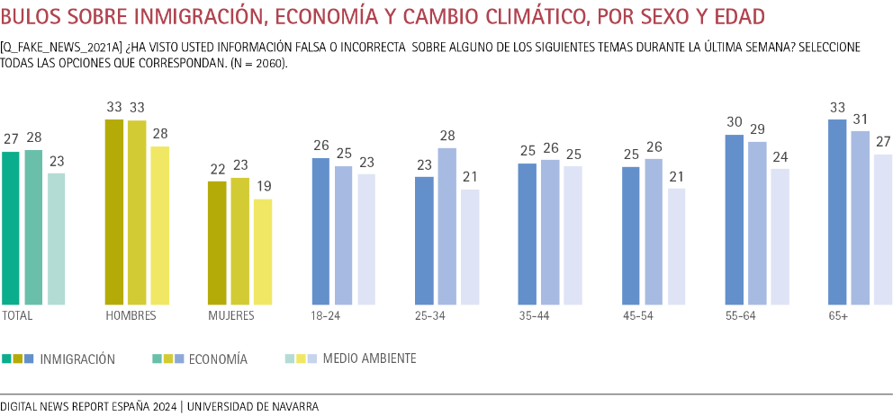 Una vez analizados los temas que proporcionan un mayor número de bulos a los que accede la audiencia, presentamos la distinción de otras cuestiones como la inmigración, la economía y las noticias medioambientales o de cambio climático. Una vez más, el porcentaje de hombres que reconoce los bulos es superior al de mujeres. Si nos detenemos en las diferencias por edad, podemos ver que los mayores de 65 años perciben más contenidos falsos sobre inmigración (33%) que sobre medio ambiente (27%). Aunque con porcentajes más bajos, esta tendencia también se percibe entre los más jóvenes (de 18 a 24 años). Sin embargo, la dinámica cambia en los grupos de mediana edad. Una mayor detección de bulos sobre economía destaca en tres franjas de edad que incluyen a participantes entre 25 y 54 años. Las cifras superan los porcentajes sobre inmigración y cambio climático. Por ejemplo, para los internautas entre 25 y 34 años el porcentaje de engaños sobre economía es del 28%, este dato coincide con las personas de 35 a 54 años (26%).