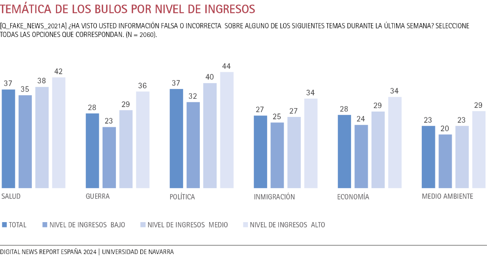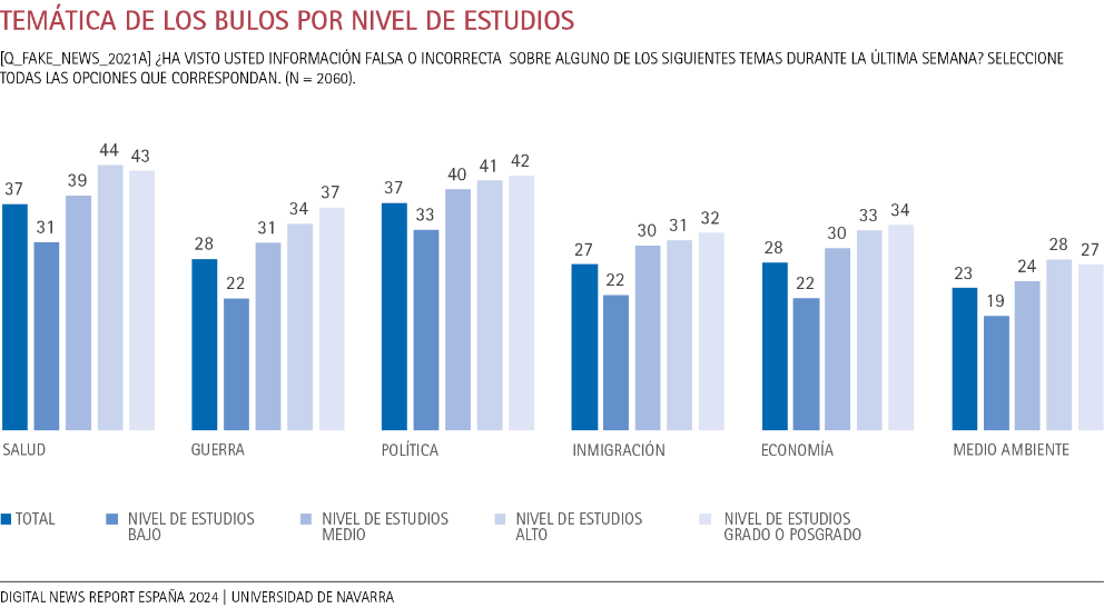 Al estudiar el reconocimiento de bulos por el nivel educativo, se observa que a medida que aumenta el grado de estudios de la audiencia, se incrementa su capacidad para reconocer la información errónea o inexacta. Una vez más, los temas de salud suscitan interés a todo tipo de público. Por ejemplo, un 43% de personas que gozan de estudios de grado o posgrado reconocen haber recibido bulos sobre esta temática, en sintonía con un 37% de la audiencia que cuenta con un nivel de estudios bajo (educación básica). Cuestiones como la alfabetización mediática y el mayor acceso a una información verificada pueden mitigar los efectos de la desinformación.