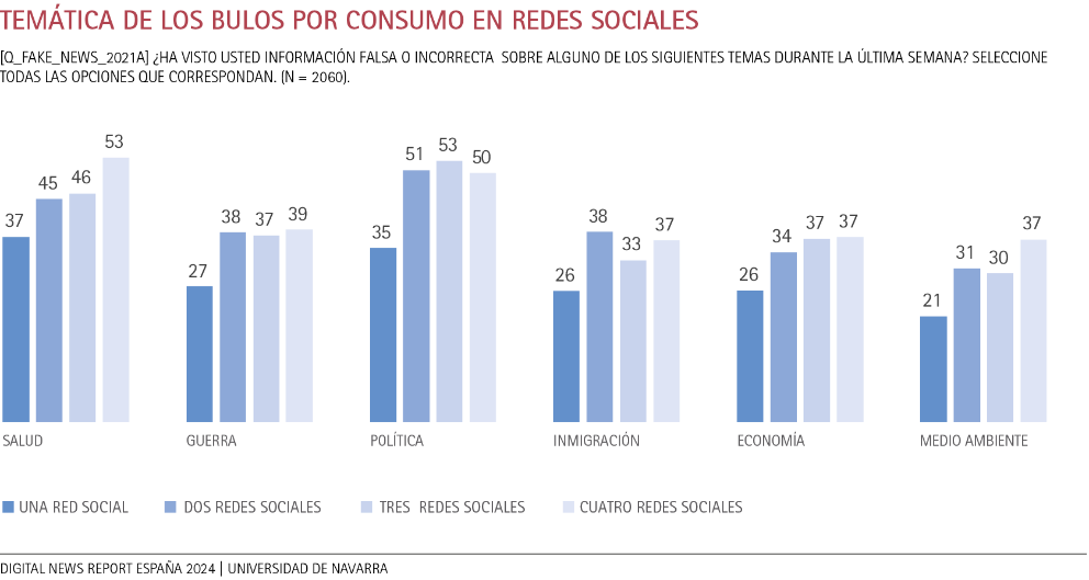 Otro aspecto a tener en cuenta tiene que ver con el fácil acceso a las redes sociales que canalizan este tipo de contenidos de desinformación. Al analizar la frecuencia con la que los usuarios de redes sociales leen o visualizan bulos en función de la variedad de temas, se observan variaciones significativas. En primer lugar, la mitad de las personas que muestran una alta actividad en redes sociales, al menos en cuatro plataformas, están más expuestas a bulos sobre salud y política. Por su parte, se percibe una menor difusión de bulos sobre guerra, inmigración, economía y medio ambiente con un porcentaje por debajo del 40%. En general, este patrón persiste (con algunas variaciones) entre las personas que consumen dos o tres redes sociales. Al centrarnos en aquellas que están operativas tan sólo en una red social, apreciamos que el 37% reconoce haber recibido bulos sobre temas de salud y el 35% sobre política. En cuanto al resto de temas, la audiencia que de forma activa percibe bulos en su red social favorita se encuentra por debajo del 30%.
