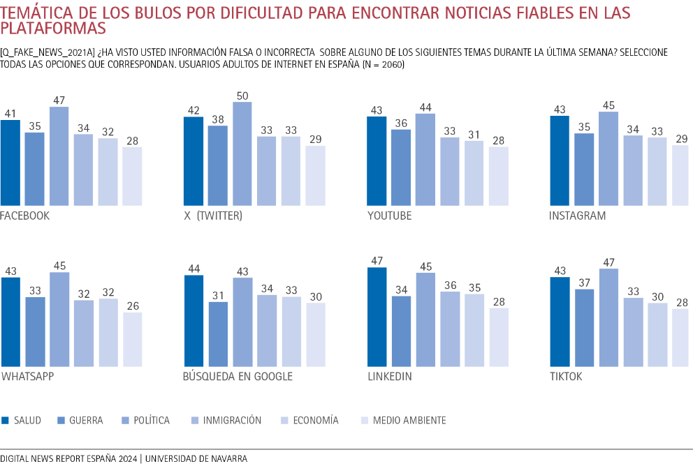 Si estudiamos la temática de los bulos por las respuestas de los usuarios que reconocen dificultad para confiar en las redes sociales, se observan diferencias por marcas. La mayor parte de los usuarios reconocen dificultad en encontrar noticias fiables en las plataformas. Las cifras son superiores al 40% en todos los casos. Las personas que tienen baja confianza en las redes sociales como canales informativos reconocen un mayor número de bulos políticos en X (Twitter). Los bulos sobre salud se manifiestan de forma similar en todas las redes sociales (en torno al 40%). Es llamativo que el porcentaje más alto (47%) se asocia a la red social LinkedIn. Por lo tanto, los usuarios reconocen que localizar información fiable a través de este medio es complicado.