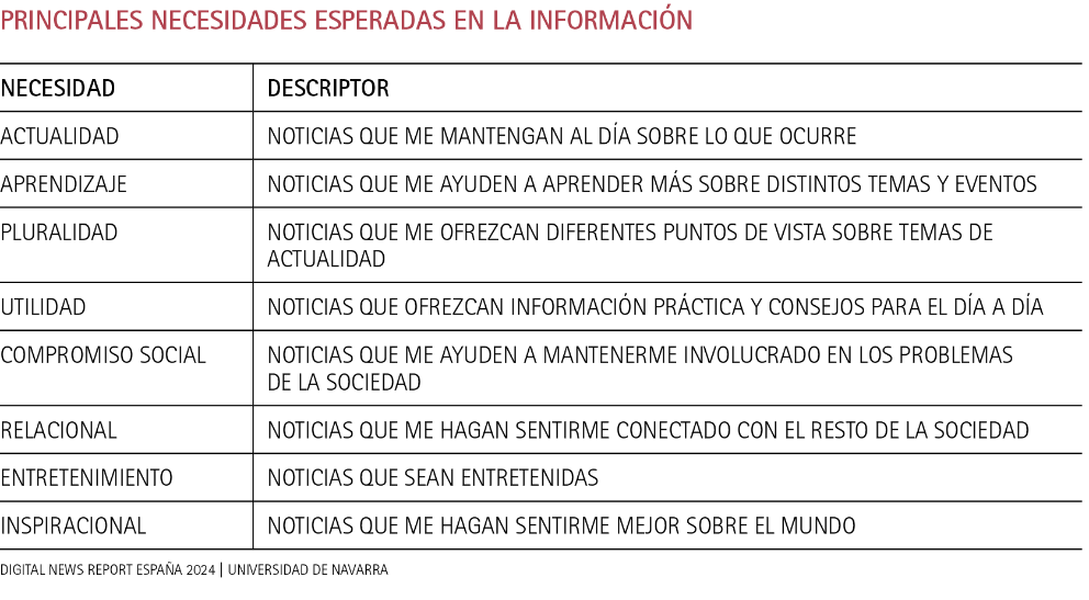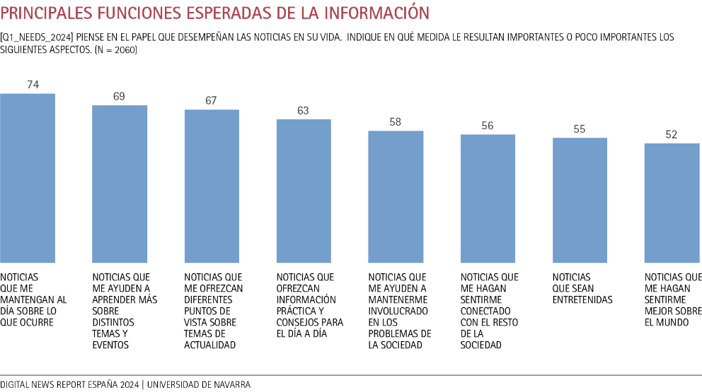 Por ello, el informe de este año ha decidido investigar en profundidad cuáles son las principales necesidades que esperan obtener los ciudadanos cuando consultan las noticias. También se les pregunta por su grado de satisfacción respecto a cómo los medios cumplen con esas funciones o necesidades esperadas por parte de los ciudadanos.