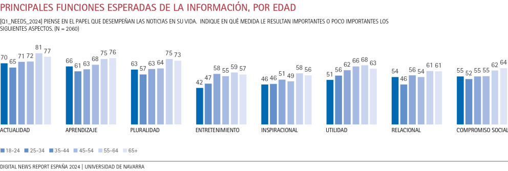 No obstante, existen diferencias por edad en algunas de las funciones o necesidades o gratificaciones. En general, los grupos más adultos valoran más todas las necesidades esperadas que las cohortes más jóvenes. Así, mientras el 80% de los mayores de 55 años espera noticias que les mantengan al día de lo que acontece, ese porcentaje se reduce por debajo del 70% en el caso de los menores de 44 años. En el caso de aquellas noticias que ofrecen diversos puntos de vista, el 75% de los mayores de 45 años las valora frente al 62% de los menores de esa edad.