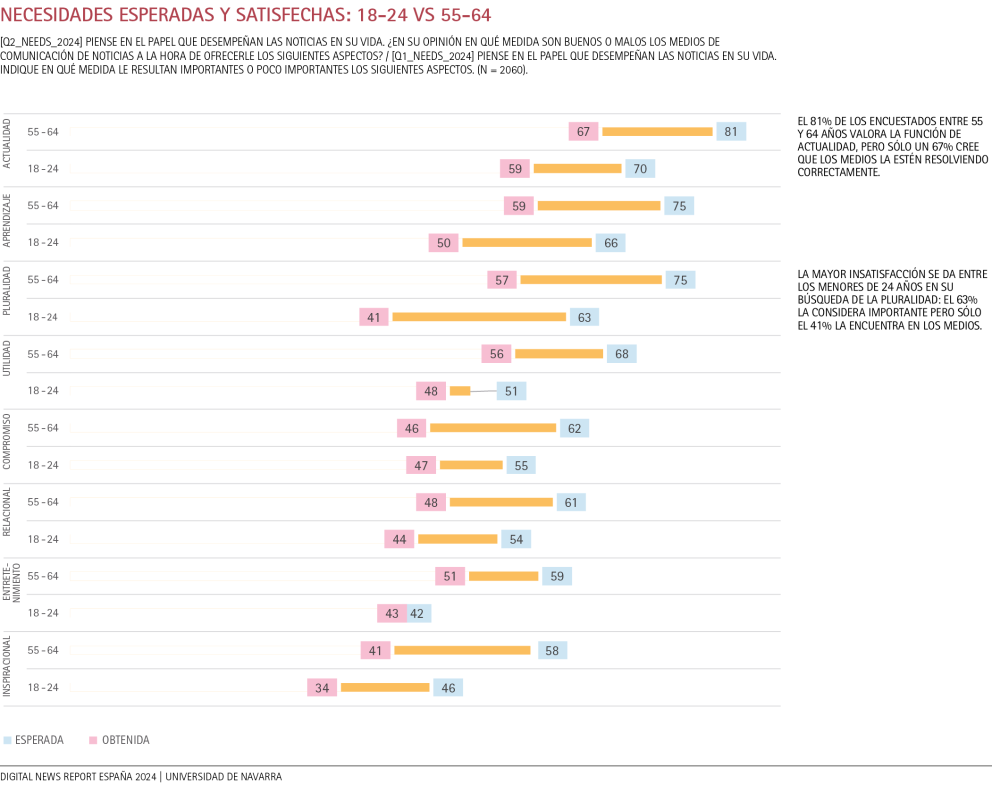 Las principales diferencias entre las necesidades esperadas y las necesidades satisfechas por las empresas informativas se encuentran en la función de pluralidad: tanto los mayores como los jóvenes consideran que esta función es muy relevante pero no está suficientemente atendida por los medios. Así, el 63% de los menores de 24 años busca pluralidad informativa pero solo un 41% la encuentra en los medios; y en el caso de los mayores, el 75% considera que la pluralidad es relevante pero solo un 57% considera que los medios la ofrezcan correctamente.