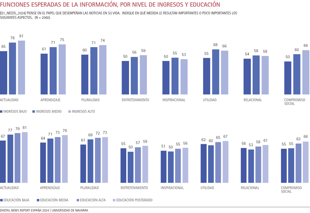 El análisis por nivel educativo y nivel de ingresos también muestra que, para la mayoría de categorías, cuanto mayores son sendas variables, mayor es la valoración de las funciones de actualidad, aprendizaje, pluralidad, utilidad e involucración.