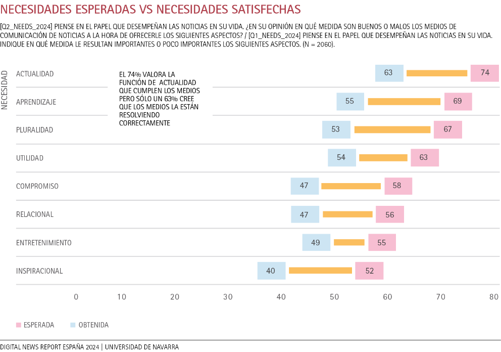 Dicho esto, la mayoría de los ciudadanos no ve colmadas sus expectativas y el porcentaje de los creen que los medios son buenos ofreciendo cada función es inferior al de ciudadanos que valoran cada una de esas funciones. Así, aunque el 74% de los encuestados afirma que acuden a los medios para estar al día de la actualidad, solo el 63% considera que los medios cumplen correctamente con esa función. La mayor brecha entre las necesidades esperadas y las necesidades cumplidas se da en las funciones de aprendizaje (el 69% la valora pero solo el 55% cree que lo medios lo están haciendo bien) y en ofrecer diversos puntos de vista (el 67% valora esta función como importante pero solo un 53% considera que los medios estén cumpliendo).