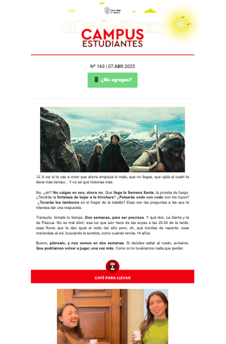 El boletín semanal de los estudiantes de la Universidad de Navarra. Cuenta la vida universitaria en estado puro, historias de alumnos, de dónde venimos, a dónde vamos, avisos importantes... ¡Todos los lunes en tu correo!