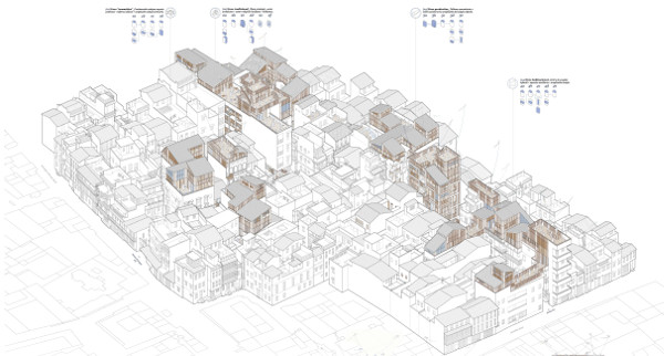 Es interesante la estrategia de colonización sobre las cubiertas inacabadas en la ciudad de Ahmedabad usando un eje intenso de “calle” en la cual agrupa la actuación, incluyendo diferentes cerramientos y “mejorando” la imagen del conjunto.