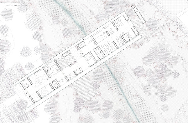 Una pieza conecta ambos bordes a modo de puente, y a través de la repetición de un sistema que organiza tanto planta como sección y que ejecuta una imagen de conjunto homogénea y amable en el contexto.