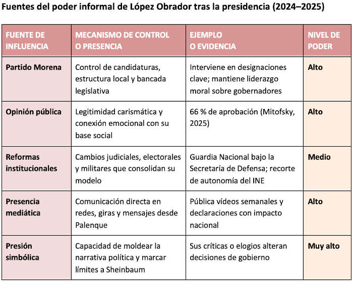 A través del control de Morena y la lealtad de gobernadores, senadores y diputados, mantiene capacidad de decisión sobre candidaturas, reformas y alianzas. Según el Wilson Center, “su movimiento funciona más como una estructura vertical que como un partido democrático”. Por ende, podemos interpretar que México tiene un doble liderazgo; la presidenta gobierna, pero el fundador del movimiento dicta la dirección del país.
