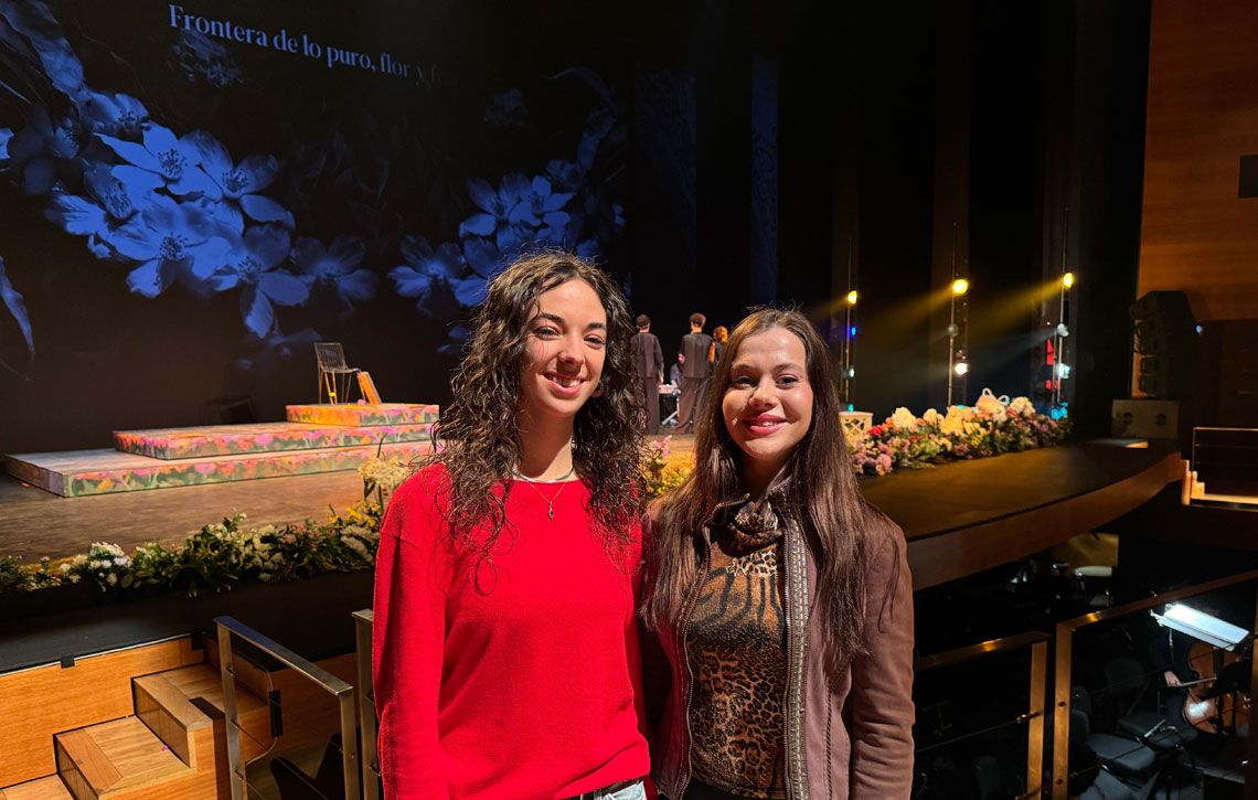 Aitana Martínez y Ángela Lizarraga, estudiantes del grado de Diseño, parte del equipo que trabajó en el vestuario y la escenografía del espectáculo "Algarabía", posan en el Teatro del Museo Universidad de Navarra.