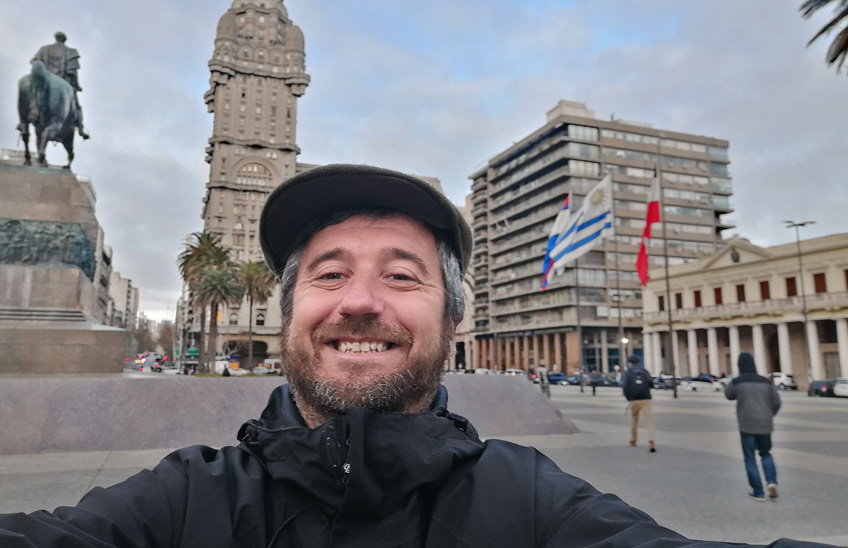 FotoCedida/Eduardo Garralda, técnico de investigación de ATLANTES, en la Plaza Independencia de Montevideo, con el Palacio Salvo a sus espaldas.
