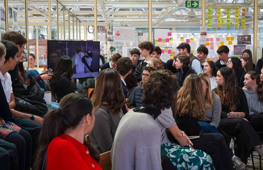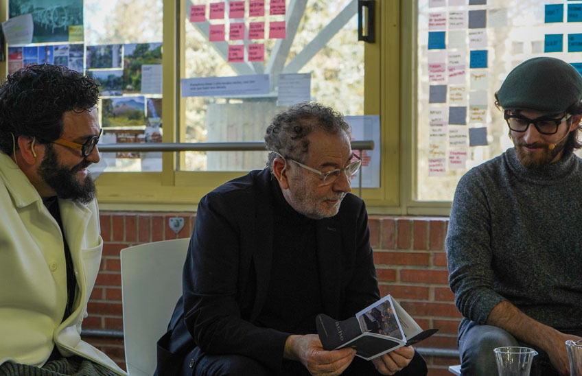 Tras recorrer los talleres de la Escuela, tuvo lugar el coloquio “Conversaciones en el taller con Roberto Verino”. Jover inició la conversación lanzando una pregunta a los futuros diseñadores: “¿quién quiere vivir 400 años?” Con esta alusión al futuro, el nieto del diseñador buscó resaltar el impacto del diseño y su posteridad, un motor que identifica a Roberto Verino, una marca que desde hace 43 años busca “querer sumar y crear impacto”, explicó. Tras décadas de consolidación de la firma en el mercado y más de 160 puntos de venta, el diseñador gallego confesó a los estudiantes que la clave reside en que “los proyectos transmitan que hay alma dentro de ellos”.