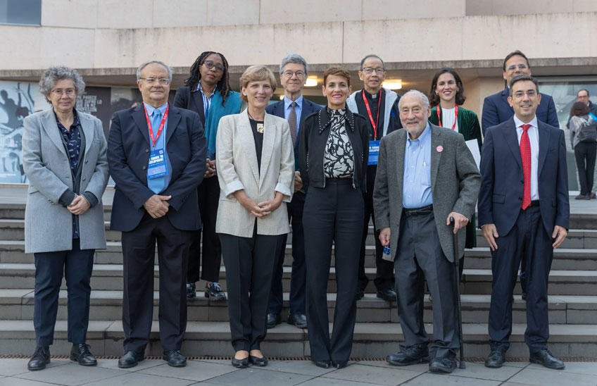 FotoManuel Castells/La rectora, María Iraburu, la presidenta del Gobierno de Navarra, María Chivite, el Premio Nobel Joseph E. Stiglitz y el economista estadounidense Jeffrey D. Sachs, junto a otros ponentes y organizadores del Congreso.