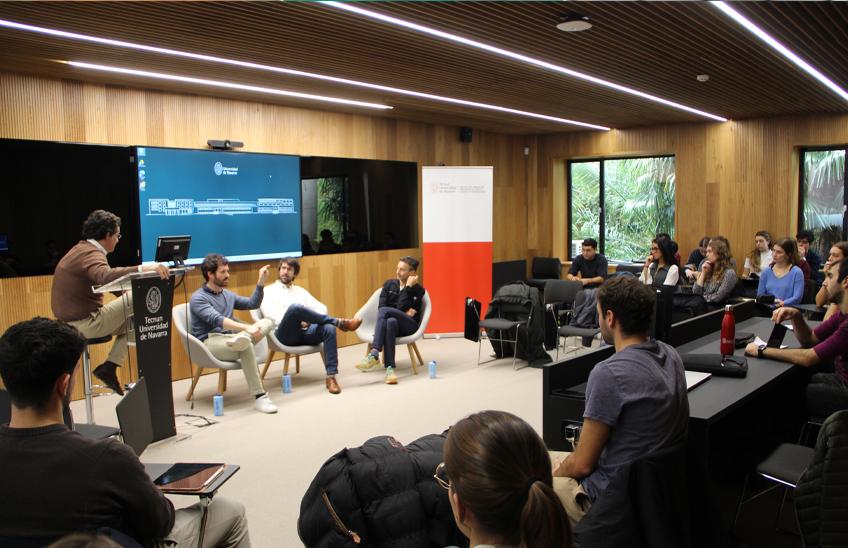 El director de la Cátedra de Emprendimiento Tecnun-BIC, Gustavo Pego, moderó una mesa redonda con los tres emprendedores, en la que pudieron intercambiar ideas y experiencias sobre los retos y aprendizajes del emprendimiento. Durante la sesión surgieron debates sobre la compatibilidad entre impulsar un negocio y la vida familiar, cómo gestionar la incertidumbre y el recorrido que sigue un emprendedor a lo largo de su carrera.
