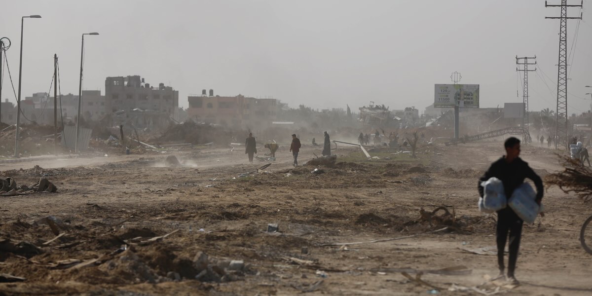 Palestinians walk amid the destruction in the Al Matahin and Al Qarara areas in northern Khan Younis, in January 2024 [UNRWA, Ashraf Amra]