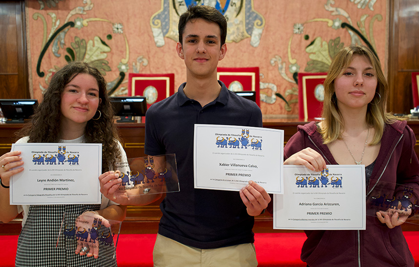 Xabier Villanueva, del colegio Escolapios Calasanz; Leyre Andión, del colegio FEC Vedruna; y Adriana García Arizcuren, del IES Basoko, han ganado la fase local de la XIII Olimpiada de Filosofía, en su modalidad de ensayo, fotografía y dilemas morales respectivamente. La entrega de premios del certamen, al que se presentaron 211 escolares de 3º y 4º de ESO y de 1º y 2º de Bachillerato de 24 centros educativos navarros, ha tenido lugar en la Facultad de Filosofía y Letras de la Universidad de Navarra. Los ganadores representarán a la Comunidad Foral en la Olimpiada Filosófica de España, que se celebrará los próximos 19 y 20 de abril en Bilbao.