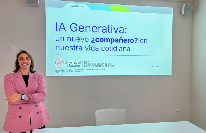 La Universidad de Navarra, a través de su Unidad de Cultura Científica y de la Innovación (UCC+I), celebró la charla divulgativa “IA generativa. Un nuevo ¿compañero? en nuestra vida cotidiana”. La actividad, dirigida a personas mayores, tuvo como objetivo acercar esta tecnología a un público con menor acceso a herramientas digitales y promover la alfabetización tecnológica como vía de inclusión social. Contó con la colaboración de la Asociación de Vecinos y Comerciantes del barrio de Santa María la Real.