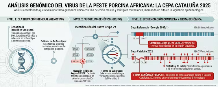 En el informe se describe la caracterización genética del virus detectado en jabalíes en Cataluña en noviembre 2025. Como su genoma es de gran tamaño (alrededor de 170 genes) y presenta una alta homogeneidad, se aplicó el esquema de caracterización de la Unión Europea. Este consiste en un análisis escalonado (distintos niveles) que permite aumentar progresivamente la resolución genética para responder a preguntas epidemiológicas complejas.
