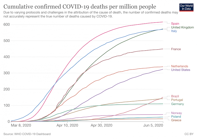 Lo que muestra The First Wave no solo se vivió en Nueva York. Es más, si comparamos la primera ola (los fallecimientos en los primeros meses) en EE.UU. y en España, la diferencia es sorprendente. Porque España fue, precisamente, uno de los países con mayor número de casos de fallecimientos por covid-19 en proporción al número de habitantes. Durante meses, España lideró el número de infectados y de muertes registradas en Europa.