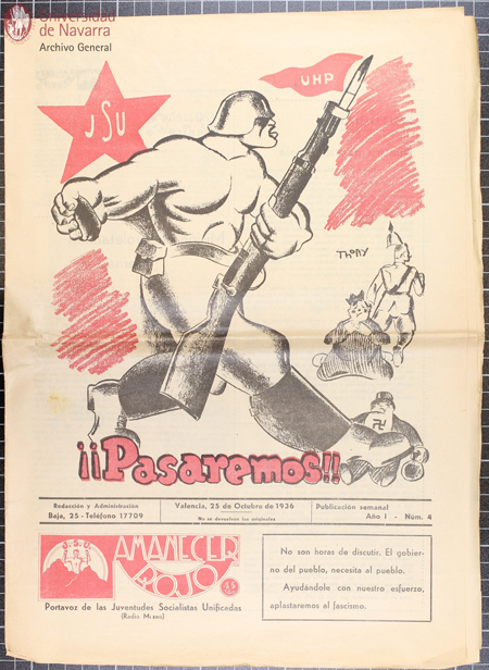 Título ¡¡Pasaremos!!, Portada del semanario "Amanecer rojo". Valencia, año I, nº 4