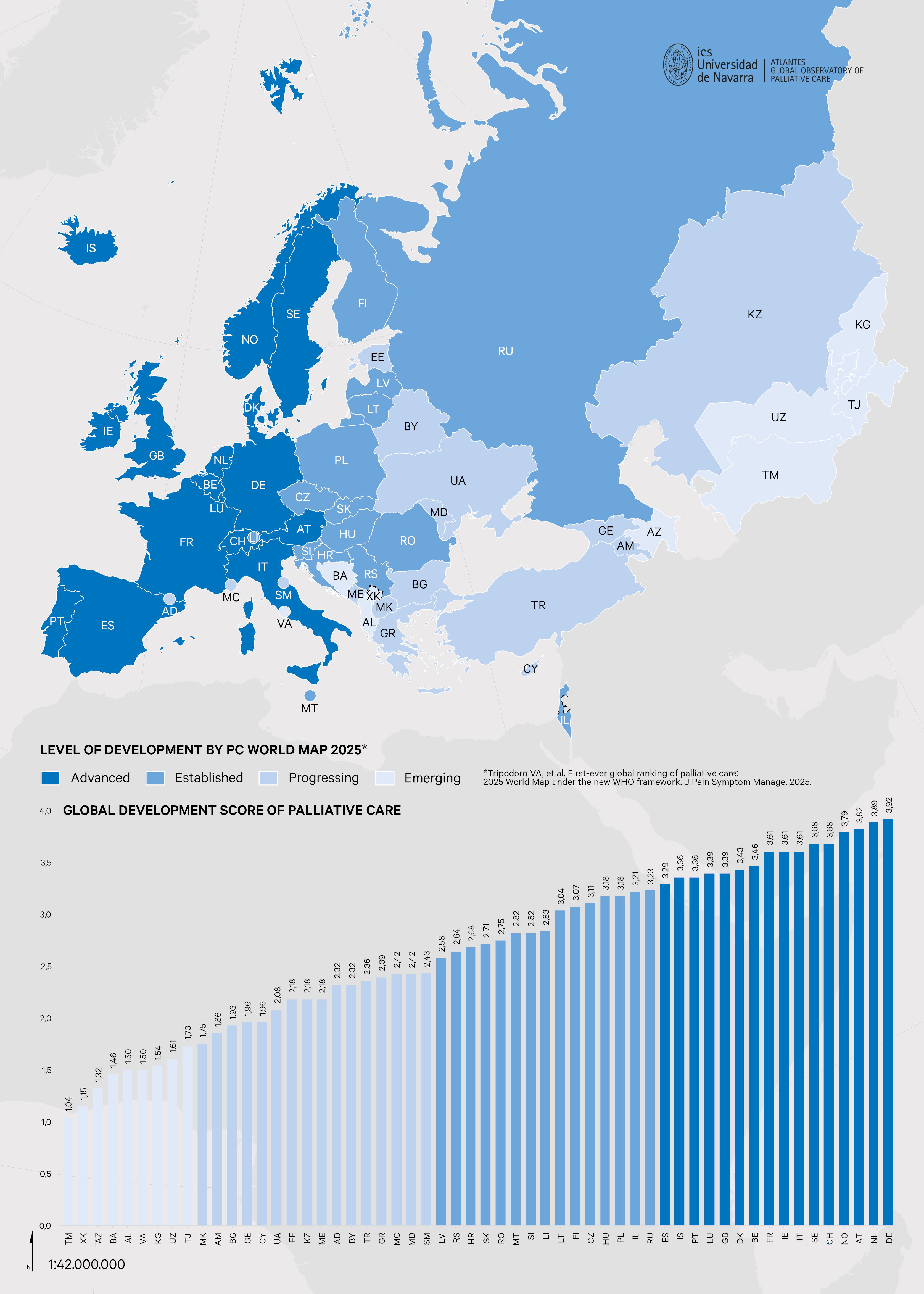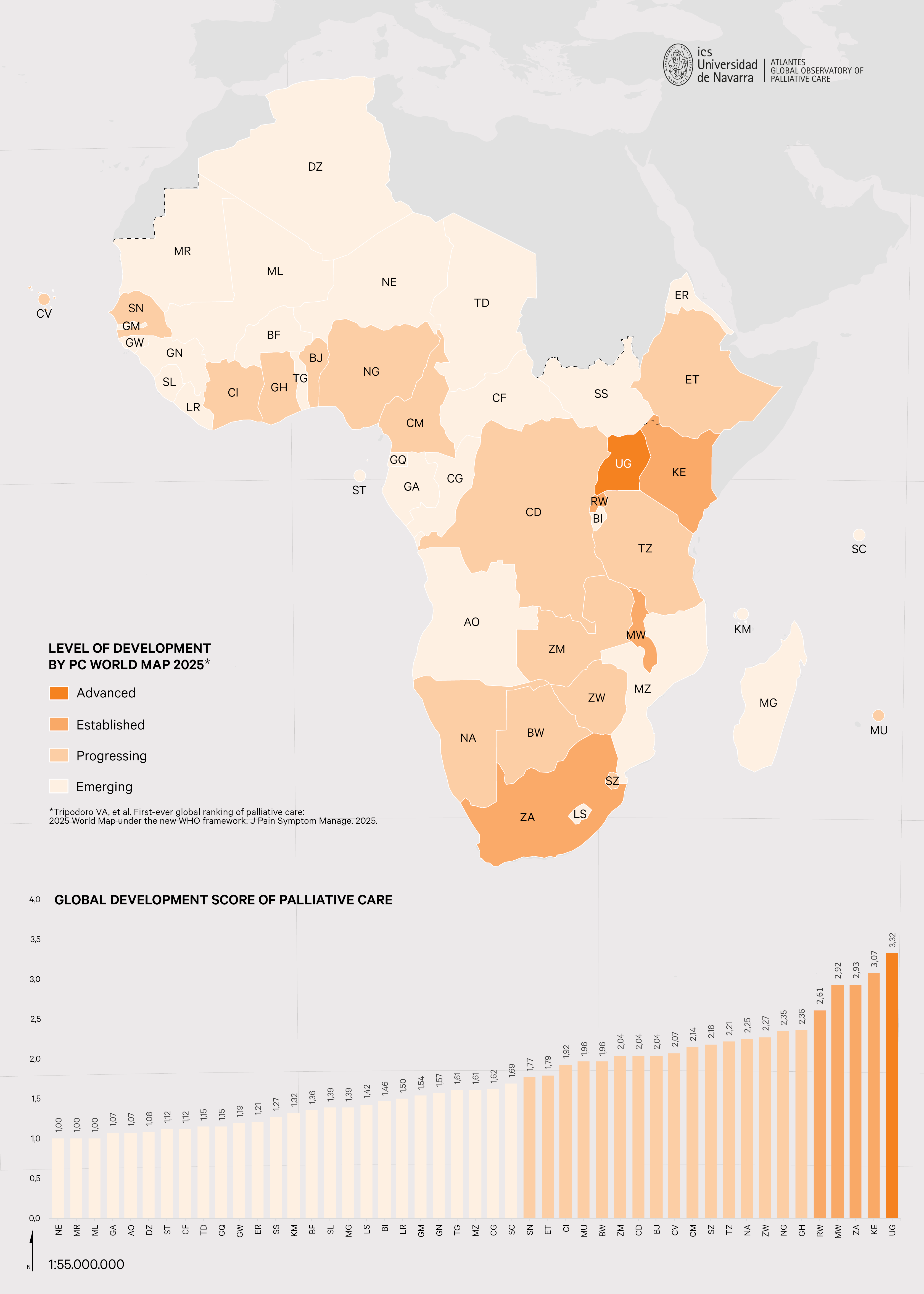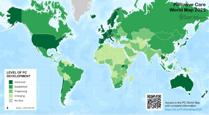 The World Map of Palliative Care, promoted by the ATLANTES Global Observatory of Palliative Care at the Institute for Culture and Society (ICS), provides a comparative analysis of 201 countries and territories, representing over 99% of the world’s population. It includes the first Global Palliative Care Ranking. This pioneering research was conducted following the WHO framework and a standardized methodology, with the collaboration of the Worldwide Hospice Palliative Care Alliance (WHPCA).