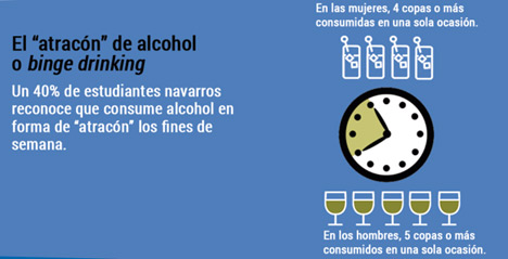 El "binge drinking" es el patrón de consumo de alcohol en atracón, correspondiente a cinco o más bebidas en hombres, o cuatro o más bebidas en mujeres, en un periodo de 2 horas (1). Lo que coloquialmente conocemos los jóvenes como el botellón.