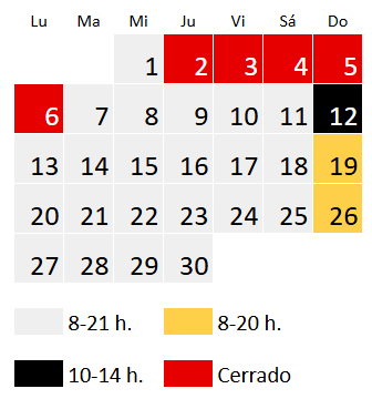 El horario en abril es de lunes a sábado de 8 a 21 h y domingo de 8 a 20 h, a excepción de los siguientes días: