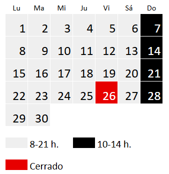 El horario en junio es de lunes a sábado de 8 a 21 h y domingo de 10 a 14 h, a excepción del siguiente día: