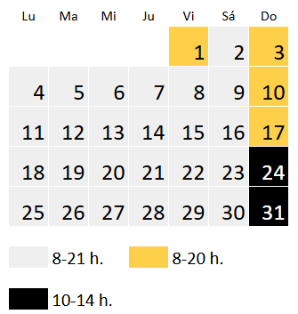 El horario en enero es de lunes a sábado de 8 a 21 h y domingo de 10 a 14 h, a excepción de los siguientes días: