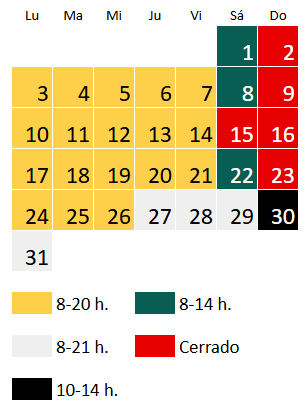 El horario en septiembre es de lunes a sábado de 8 a 21 h y domingo de 10 a 14 h, a excepción del siguiente día: