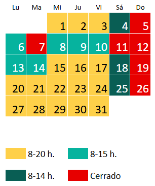 El horario en julio es de lunes a viernes de 8 a 20 h y sábado de 8 a 14 h, a excepción de los siguientes días: