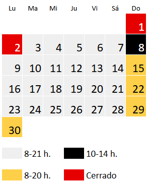 El horario en noviembre es de lunes a sábado de 8 a 21 h y domingo de 8 a 20 h, a excepción de los siguientes días: