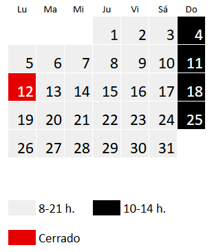 El horario en diciembre es de lunes a sábado de 8 a 21 h y domingo de 8 a 20 h, a excepción de los siguientes días: