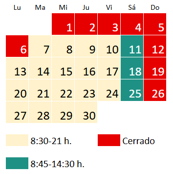 El horario en abril es de lunes a viernes de 8:30 a 21 h y sábado de 9:45 a 14:30 h, a excepción de los siguientes días:
