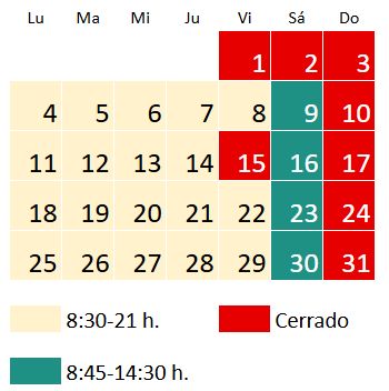 El horario en mayo es de lunes a viernes de 8:30 a 21 h y sábado de 9:45 a 14:30 h, a excepción de los siguientes días: